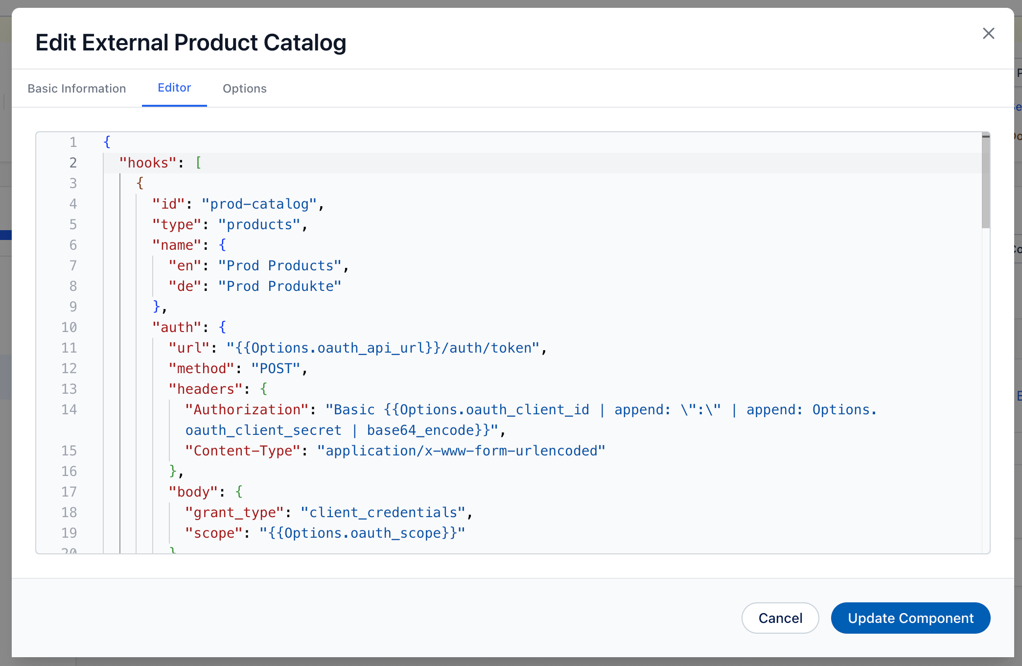 Below is an example of a configuration for the products hook, assuming a typical OAuth2 authentication flow, where the client credentials are stored in the app options.