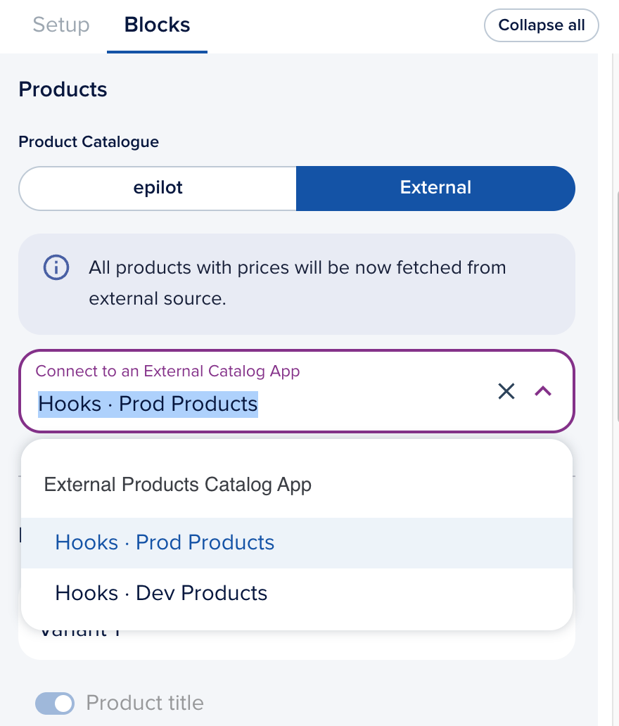 When a journey creator adds a Product Block or Product Recommendations Block in a journey, they can select the integration as the source for products. Only hooks that are supported for the selected block type will be available (e.g. only products hook for Product Block, only productRecommendations hook for Product Recommendations Block).